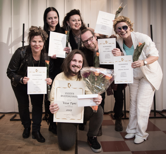 Tässä kuusi Vuoden Muotokuvaaja 2015 -kisan parasta, takarivi vasemmalta: Johanna Sjövall, Heidi Järvi, Irina Kolomijets, Peero Lakanen ja Johanna Uusitalo, kurkon ollessa nöyrän onnellisessa polviasennossa. Ihmettelijöille todettakoon, että juhlagaalassa oli oli pukeutumiskoodina ”retro”…