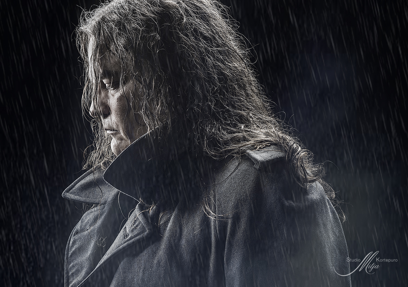 Kuvatessaan minua Mitja halusi leikkiä suihkupullolla ja jatkoi samaa teemaa käsittelyssäkin. Mallina olen parhaimmillani silloin, kun saan esittää kallioon hakattua patsasta. Ja Varustelekasta ostamani vanha ylivääpelin mantteli pääsi ensi kertaa käyttöön.