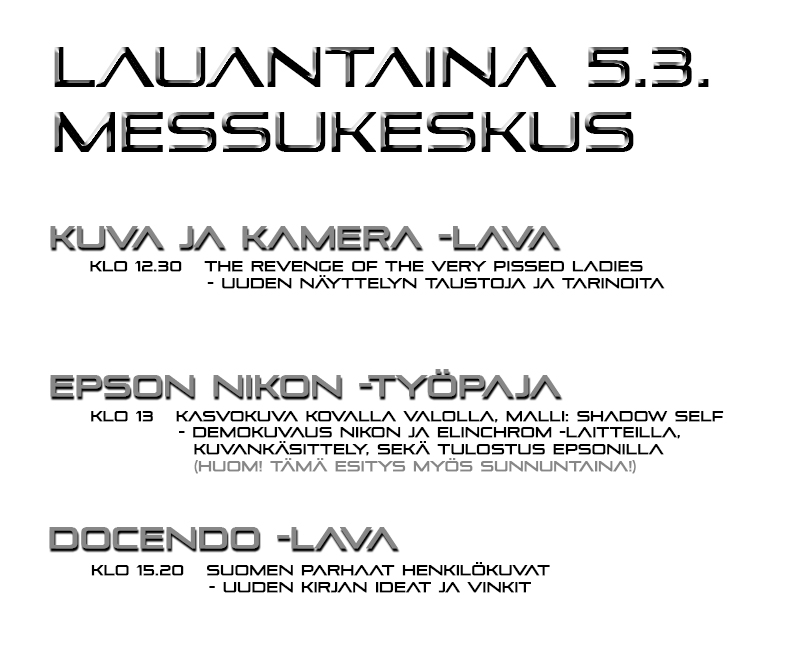 Suomen Parhaat Henkilökuvat -kirja sekä The Revenge Of The Very Pissed Ladies -näyttelyni julkaistaan messuilla. Sen lisäksi, että esittelen kumpaakin projektia olen mukana myös Epson-Nikon työpajassa. Kirjasta sen verran kuulumisia, että ennakkotilaajille on jo toimitukset alkaneet, vaikka virallinen julkaisu vasta tuolla onkin…
