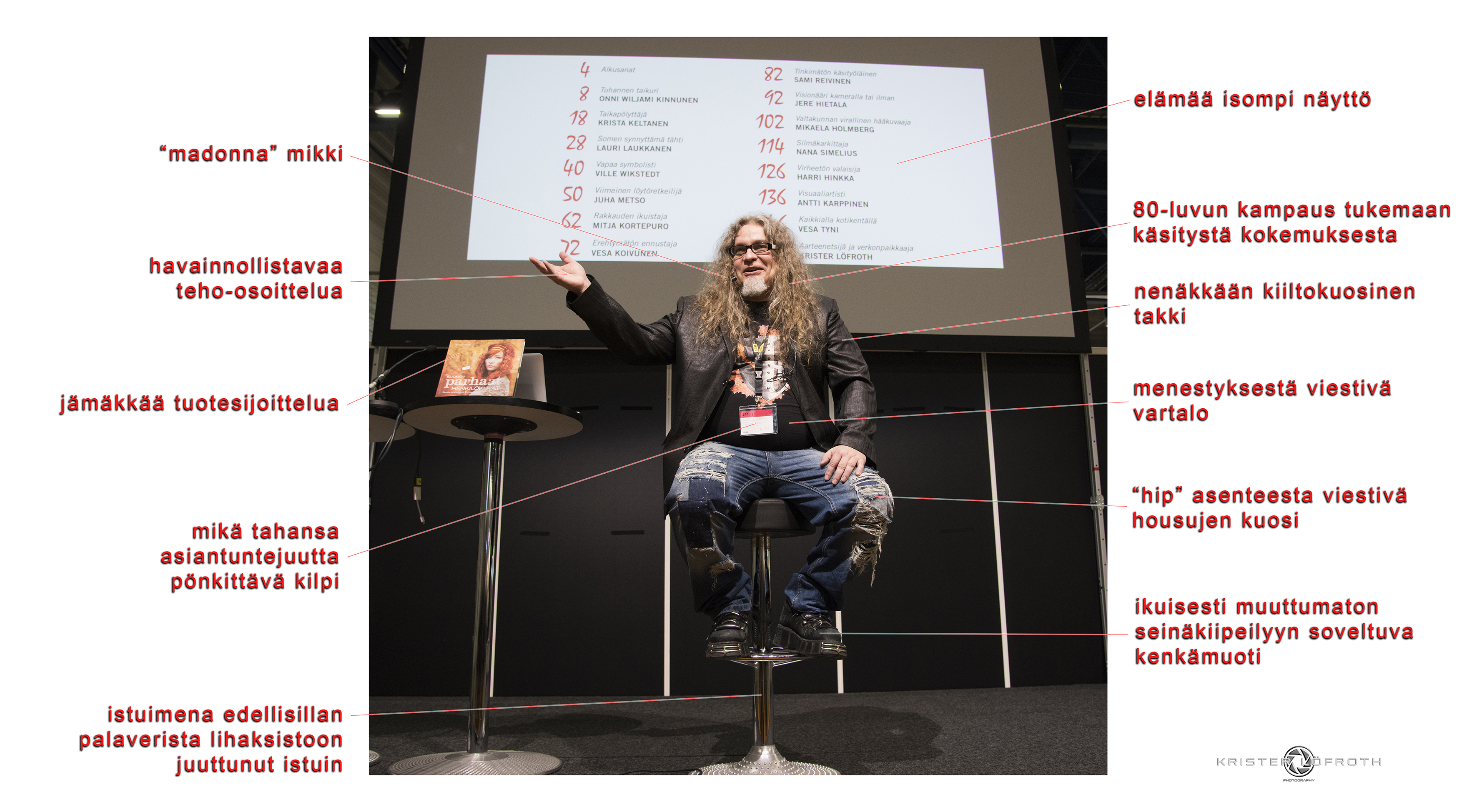 Yleisesti on vallalla käsitys, että luentojen sisältö ratkaisee, että sisältö on lähes sata prosenttia esityksen painoarvosta. Mutta tämä ei pidä paikkaansa! Tänä ulkokultaisuuden aikakautena, jona sisältö-sana ei edes tunnista muinaista kaimaansa, on tärkeintä vain se, miltä luennoitsija näyttää ja miten hän messagea viestittäisi, jos sellainen olisi olemassa.