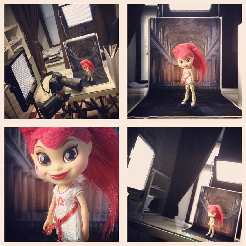 Nythän voi käytännössä printata minkä kokoisia tiedostoja tahansa kankaalle. Lapualla Mainos Santala printtaa kangasta maksimileveyden ollessa tällä hetkellä 310 cm (ja toiseen suunta ei rätit lopu heti kesken). Eli siis koko riittää vaikkapa oman taustan printtaamiseen, kuten olen tehnytkin. Ennen varsinaisia tulostuksia duunailin tietenkin testit pienempinä ihan taloudellisista syistä. Joten valaisin nuken kahdella led-valolla (ja taustan yhdellä Dedolla), kiskasin kuvat kahdella eri polttovälillä (kun terävyysalueen pituudethan eivät ole samoja pygmien ja koripalloilijoiden maailmoissa).