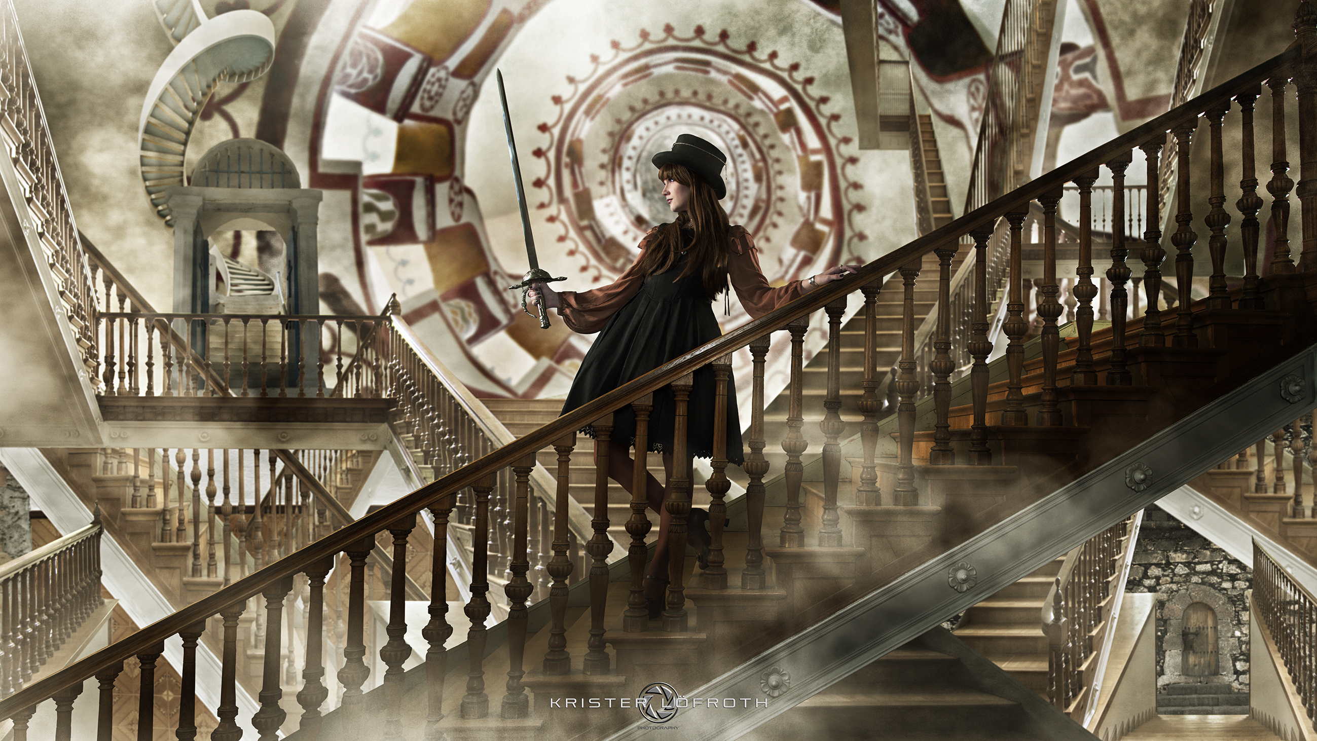 Tämä kuva kuvattiin noin vuosi sitten Hiedanrannan kartanossa ja kuten aina Saijan kanssa, niin tälläkin kerralla neito ilmestyi sovittuna aikana upean puvun (ja varustusten) kera hoitaen posettamisen täysin ammattimaisesti. Kuvaustilanteessa pääsin superhelpolla, mutta tämän kuvan käsittelyn aikana täytyy kyllä tunnustaa, että kaidepuita ”irrotellessani” oli istumalihakset koetuksella.  (Nikon D810 + 14-14mm f2.8 & Elinchrom Ranger + Quadra)